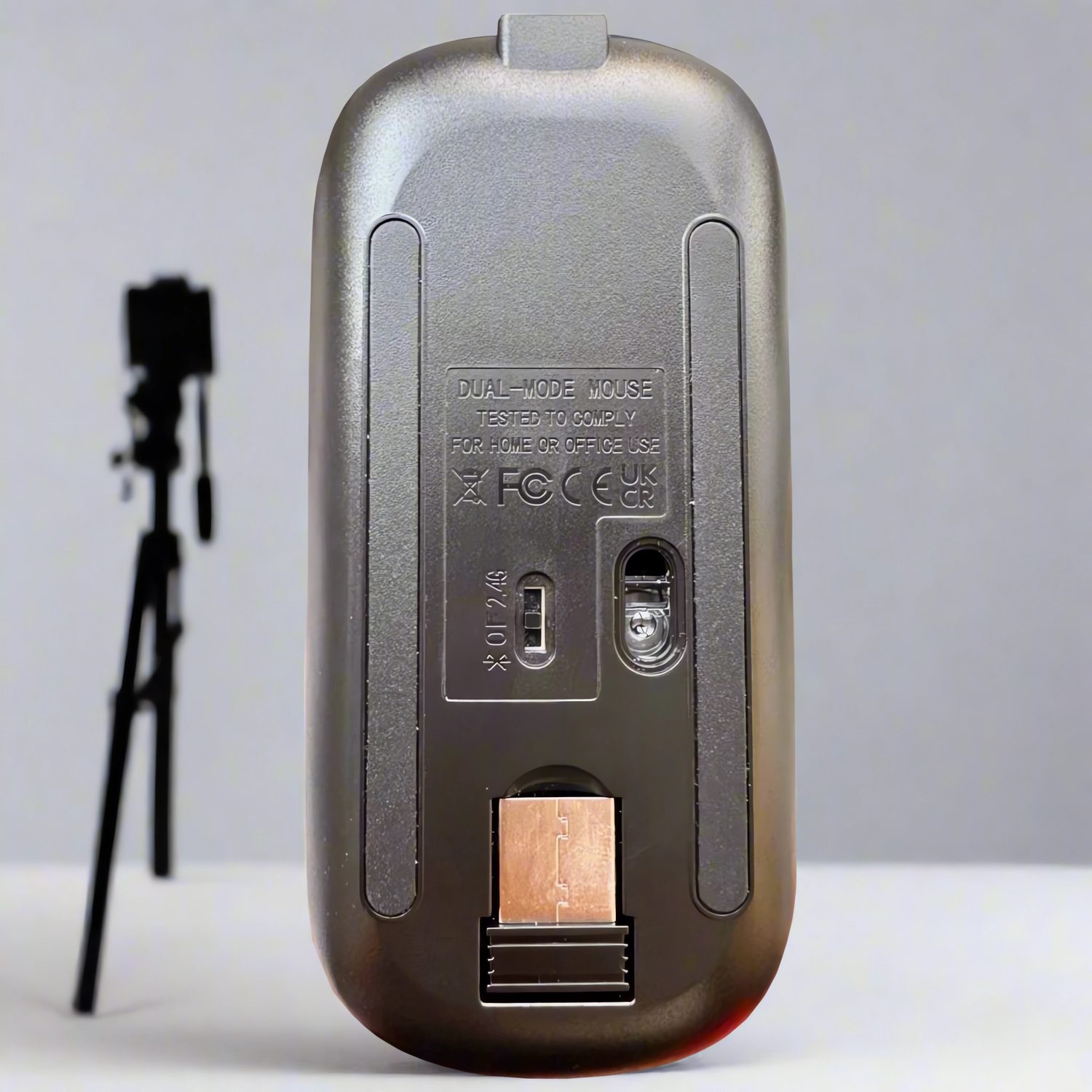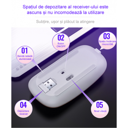 Bervolo® RGB Egér, Dual Wireless USB és Bluetooth, Ultra-Vékony, Halk Kattintás, Újratölthető Akkumulátor, Színes Világítás, Állítható 800, 1200, 1600 DPI, Space Gray