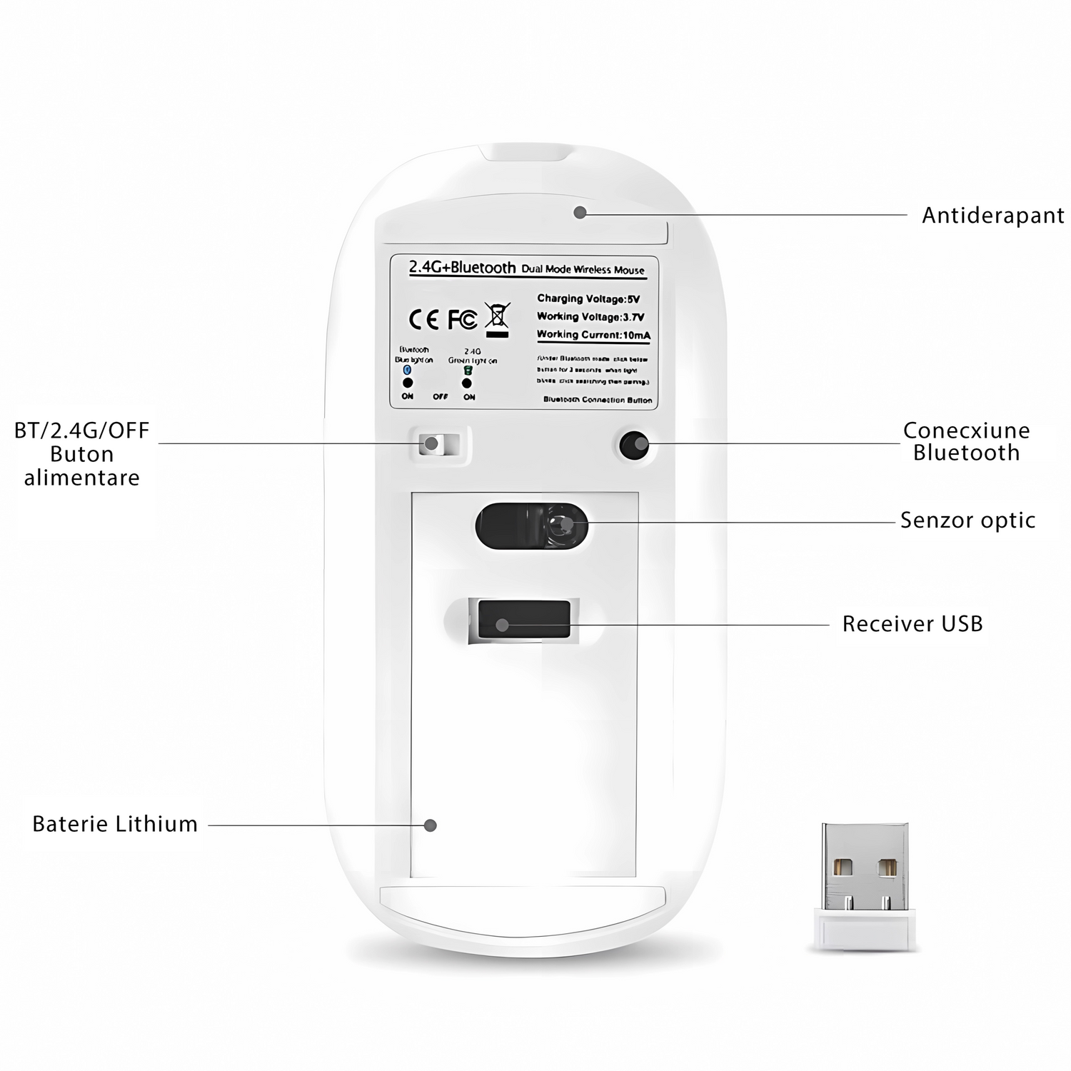 A BT mód Windows / Android / MAC operációs rendszerrel működik (kompatibilis az imac one géppel / macbook / macbook air / mac minivel (nem kompatibilis ipad / iphone készülékkel). A 2,4 GHz-es mód laptoppal, asztali számítógéppel vagy bármilyen USB-porttal rendelkező eszközzel működik, egyszerűen csatlakoztassa az USB-vevőt, és játsszon (az USB-vevőt az egér hátulján tárolja).