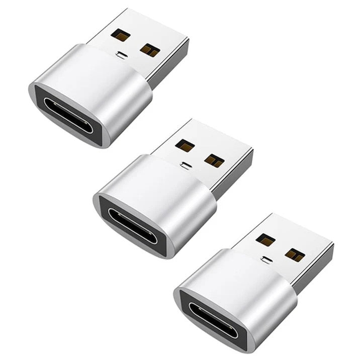 Set of 3 Bervolo® OTG Adapters USB-A to USB C, Fast Charge 3A, Fast Data Transfer, Aluminium Case, Compact, Silver